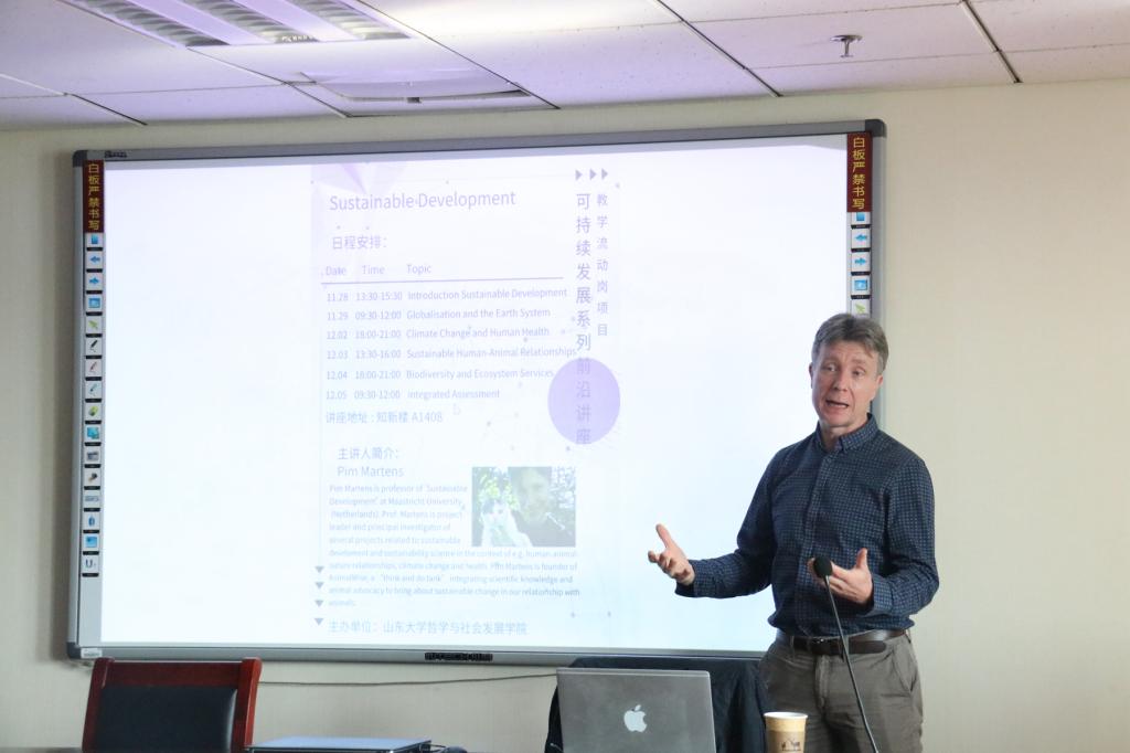 11月28日-12月5日,荷兰马斯特里赫特大学Pim Martens 教授做客哲社学院可持续发展系列前沿讲座,先后作了“可持续发展导入、人与动物关系、气候变化与人类健康、生物多样性与生态系统”等多个主题的报告,社会学系苏冰涛老师主持。