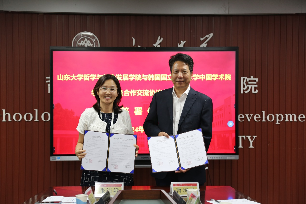 会上,曹现强副校长、张祯娥院长分别代表双方签订合作交流协议。协议以建立中韩关系研究、中国研究、华侨研究等学术研究领域的持续合作关系为共同目标。此次合作协议的签署,将成为两校友谊与合作的新起点,开启双方共同发展的新篇章,为亚洲及全球的合作发展贡献更多的智慧与力量。山东大学人类学系讲席教授文玉杓、山东大学人类学系一级教授金光亿、国际部副部长陈凌,成人在线免费视频部分领导教师参加了会议。会议由山东大学成人在线免费视频人类学系系主任舒萍主持。