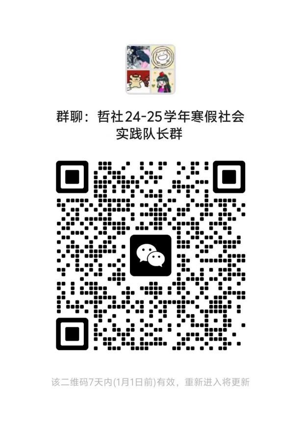 请社会实践团队负责人扫描二维码入群,入群后请按照“队伍-姓名”的形式修改群备注。立项答辩等后续相关工作通知将于群内发布。