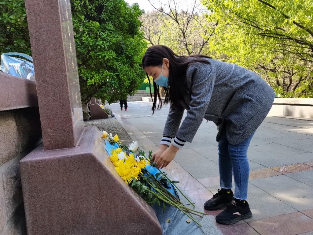 上午9时许,同学们秩序井然地来到烈士陵园,他们每个人佩戴团徽,手持白菊,放在左胸前,庄严肃穆,徐徐走向烈士陵墓,同学们上前鞠躬献花,希望为安睡的英灵们送去馨香。