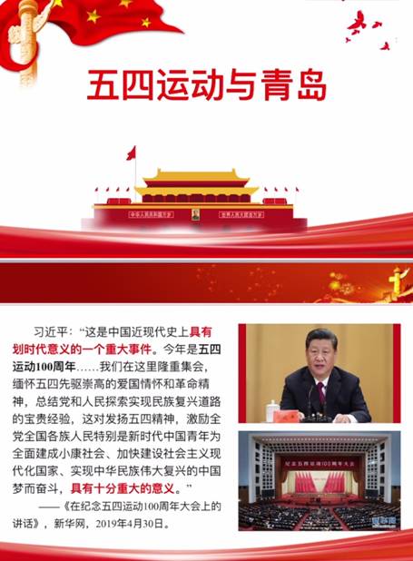 座谈会开始,支部书记史艺姝以《五四运动与青岛》为主题,以习近平总书记在2019年纪念五四运动100周年大会上的讲话为指导,向支部成员介绍了五四运动的历史背景、基本经过、相关人物和历史启示四个方面,和与会同志一起重温了那段慷慨激昂的革命历史,共同学习习近平总书记的讲话精神。