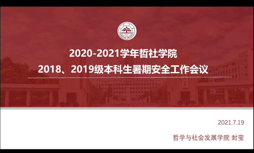 为切实做好2020-2021学年暑期学生安全管理工作,保障学生的人身和财产安全,力求学生安全、愉快度过假期,哲社学院于2021年7月19日晚7:30面向2018、2019级本科生召开暑期安全工作年级会,此次会议通过线上方式进行,由辅导员封莹主持。