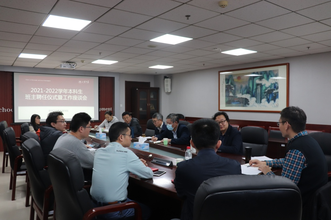 11月1日下午,哲社学院于知新楼A1618举行2021-2022学年本科生班主任聘任仪式暨工作座谈会。院长刘森林、党委书记郑倩、副院长程胜利及全体本科生班主任、辅导员参加此次座谈会。座谈会由党委副书记李永卫主持。