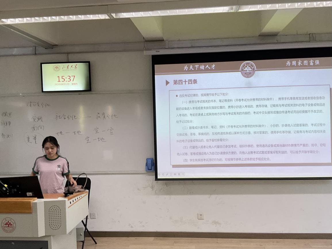 为深入贯彻学校关于严肃考风考纪的工作部署,进一步营造公平、公正、诚信的考试氛围,山东大学成人在线免费视频本科生辅导员班梦姣、封莹分别于知新楼A1521和信息楼B501组织召开四六级考风考纪主题教育会议,哲社学院全体本科生到场参会。