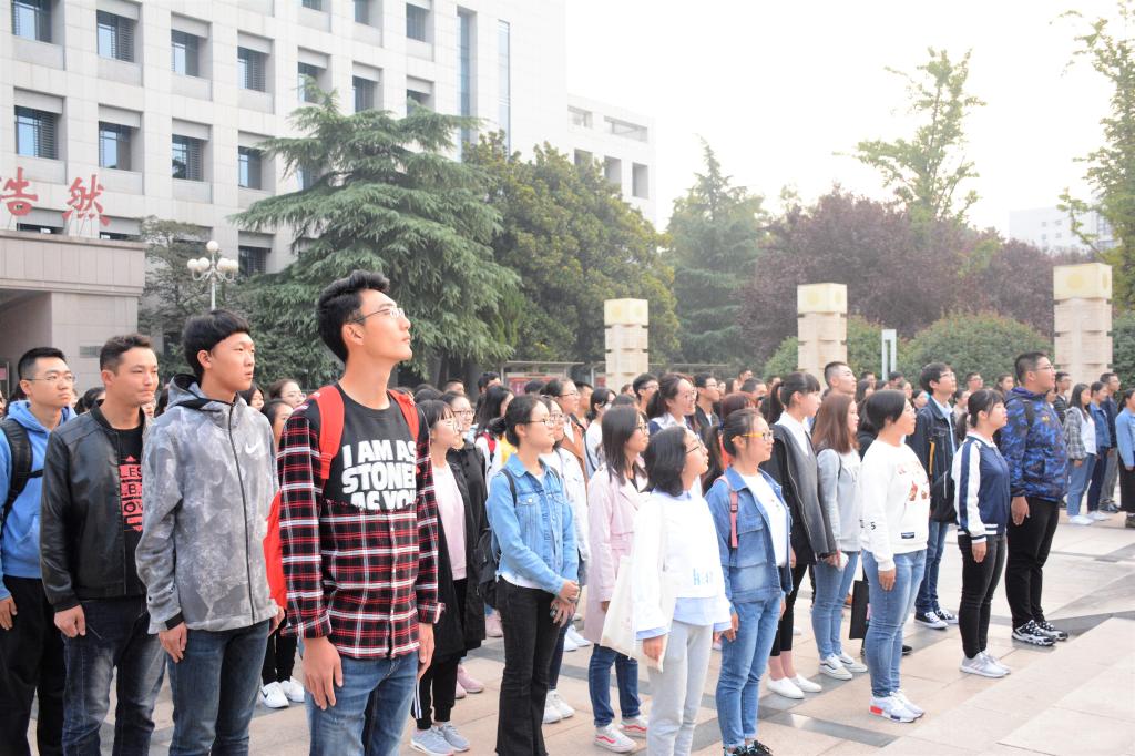 2018年10月8日,哲社学院在大成广场升旗台前举行了2018级本科生新学期升旗仪式。辅导员马雁思与哲社学院全体本科新生参加了本次仪式。