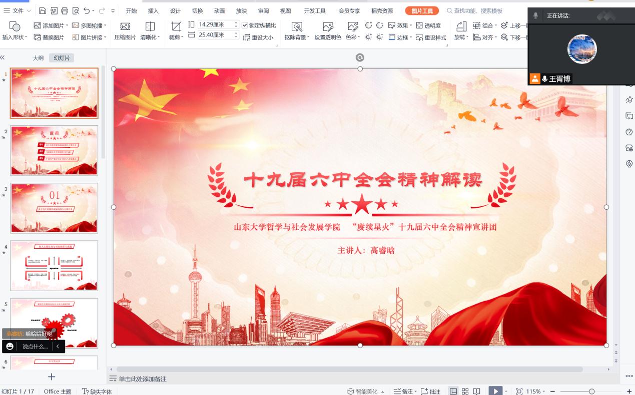 为积极宣传党的十九届六中全会精神,引领广大群众坚定不移听党话,跟党走,山东大学哲社学院“赓续星火”十九届六中全会宣讲团赴临沂市宋家王庄社区进行宣讲,本次宣讲面向社区居民委员会成员,考虑到当地疫情防控政策要求,经宣讲团成员与社区负责人沟通协商,本次宣讲会采用线上宣讲的方式进行。