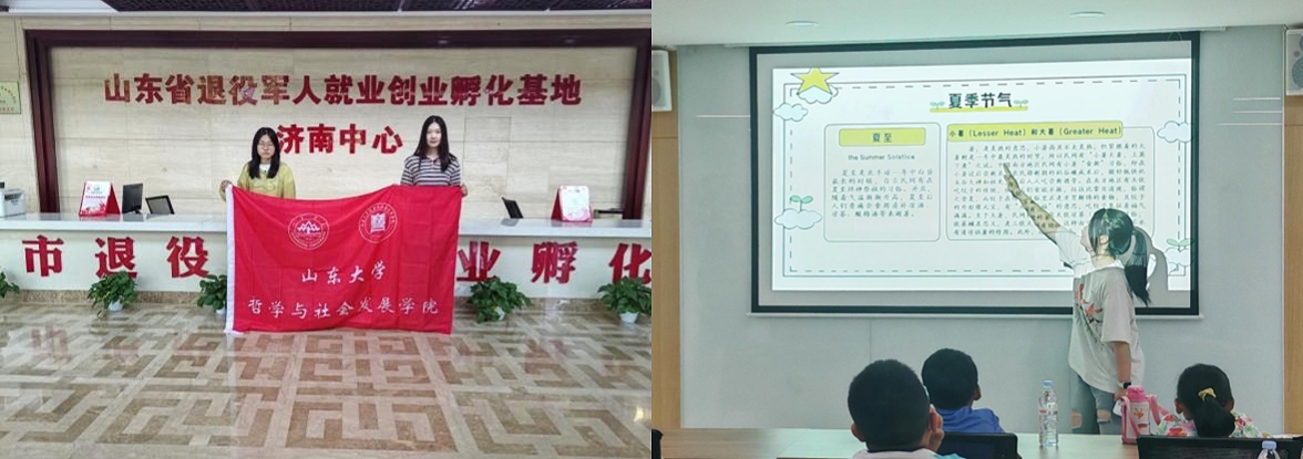 “服务有温度,青年有力量”。为进一步了解退役军人就业创业现状及退役军人就业创业服务发展现状,哲社学院“戎创齐鲁”调研团前往山东省退役军人就业创业孵化基地——济南中心开展实地调研,与基地管委会负责人陈霞、基地运营团队工作人员王鑫等4人、军创企业负责人崔兆虎进行访谈。在为退役军人就业贡献力量的同时,也引领青年学生厚植家国情怀,勇担时代使命。同时为响应“优秀文化进社区”号召、推动中华优秀传统文化传承,“童声绘古今——文脉使者培养企划”实践团队于山东省济南市智远街道兴港悦城社区开展了一场融合英语教学与中华优秀传统文化的课外活动,既提升了社区学生的英语应用能力,又深化了其对传统文化的认同,展现了“高校-社区”联动传播文化的积极价值,推动助力培养能用中国声音讲好中国故事的人才。