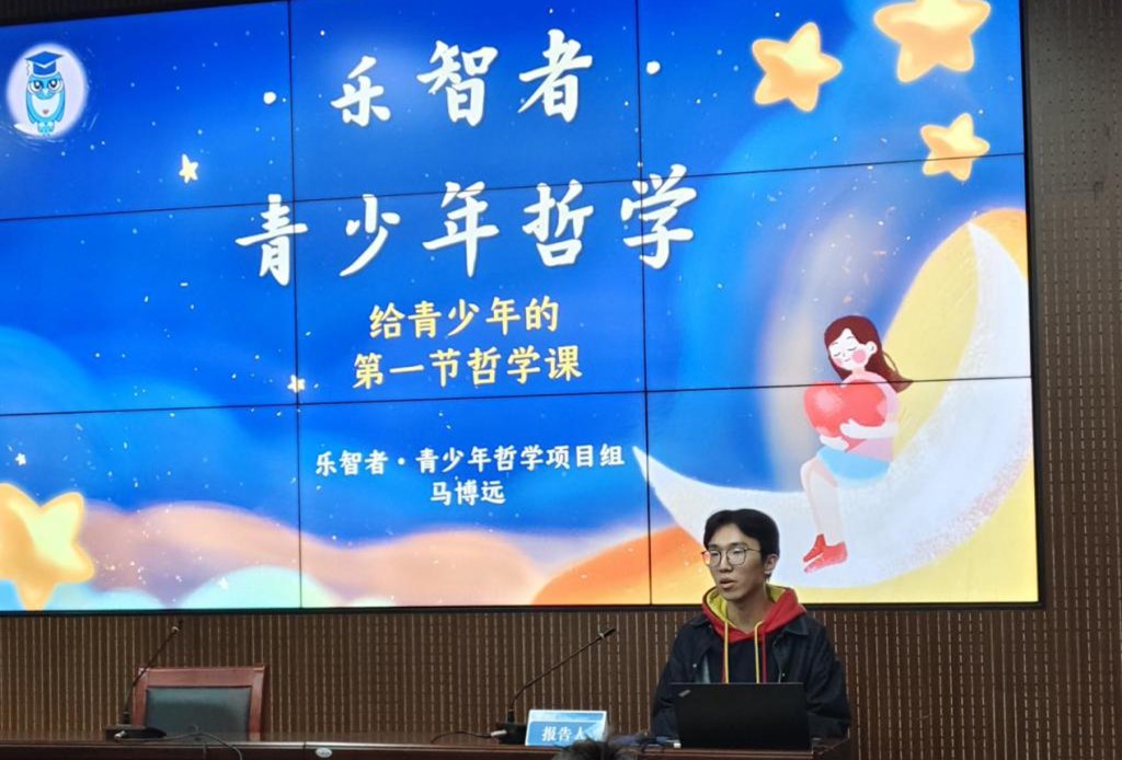 活动伊始,哲社学院乐智者·青少年哲学项目组负责人马博远从“项目背景”、“项目设计”和“项目成果”等多个角度论证“乐智者”青少年哲学课项目的创新性、可行性及推广价值。在思辨的项目论证里,同学们逐渐认识到如何确立和完善一个项目,例如,如何从专业出发找寻问题与需求、拥有项目雏形后如何进行项目设计、具备项目规划后如何落地实践与成果产出。