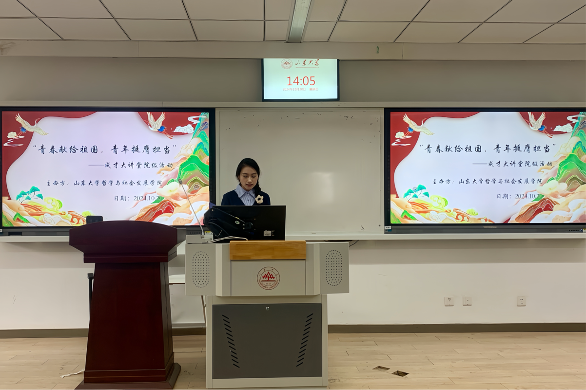 活动现场,各年级主讲人各展风采,借助情景剧、短视频、故事分享等生动形式,结合个人在学术科研、创新创业、社会服务等方面的成长轨迹,从不同的角度展开分享,生动诠释了新时代山大青年的使命与担当。情景剧演绎跨时空对话,回顾祖国百年筚路蓝缕;短视频记录支教足迹,唱响青春奉献成长之歌;讲述山大师生报国事迹,映照爱校荣校真挚情怀;回顾参军入伍历程,号召强化青年责任担当。