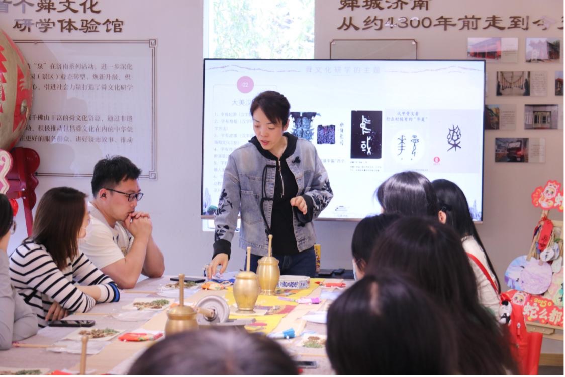 5月6日,山东大学成人在线免费视频师生前往济南舜文化体验基地开展研学活动。舜城文昌书院院长张雨桐带领师生实地探访“尧帝访贤”“历山溯源”“舜耕历山”等文化景观,通过文物讲解与场景还原,系统阐释舜文化中“德、孝、仁、和”的价值内涵。孙志轩同学表示:“老师解读‘德’字的‘行正守心’之意,让我深刻认识到先贤思想对中华文明传承的深远影响。”尹洁认为“当代社会主义核心价值观中‘和谐’‘友善’等内容与舜帝治理思想一脉相承,这种跨越时空的精神共鸣令人深受启发。”