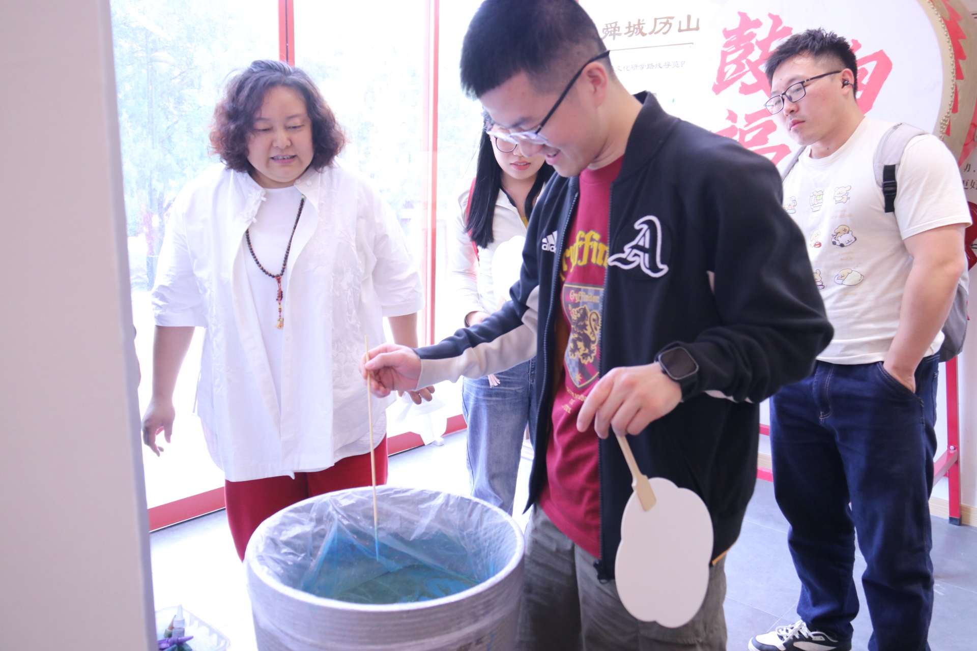 5月6日,成人在线免费视频师生在山东大学研究生联合培养基地导师、舜文化体验馆馆长陶丽丽及非遗传承人的指导下,共同开展中药香囊、漆扇及书法创作活动。通过亲身体验传统技艺,师生在实践中共悟文化精髓,深化导学互动。耿倩在漆扇创作中感悟到流动的东方色彩不是标本,而是新时代青年续写的新年轮;钟林杉在与老师一同制作香囊时感慨道:“一针一线的‘笨功夫’,恰是治愈现代浮躁的良方。”贾祥瑜认为此次非遗制作是“掌心对时光的温柔叙事”,其中不仅蕴含了传统技艺的传承,更感受到了师生之间的情感联结。